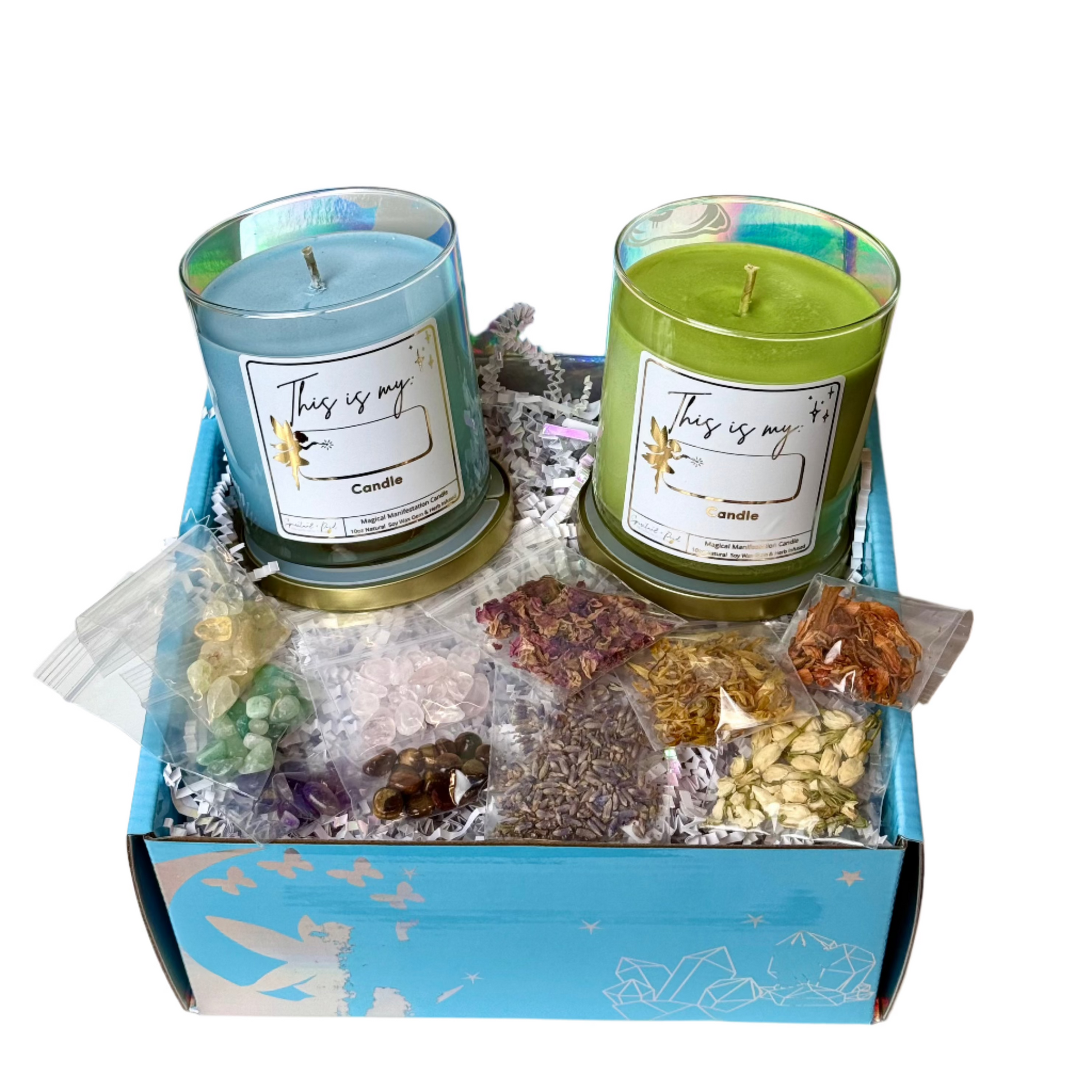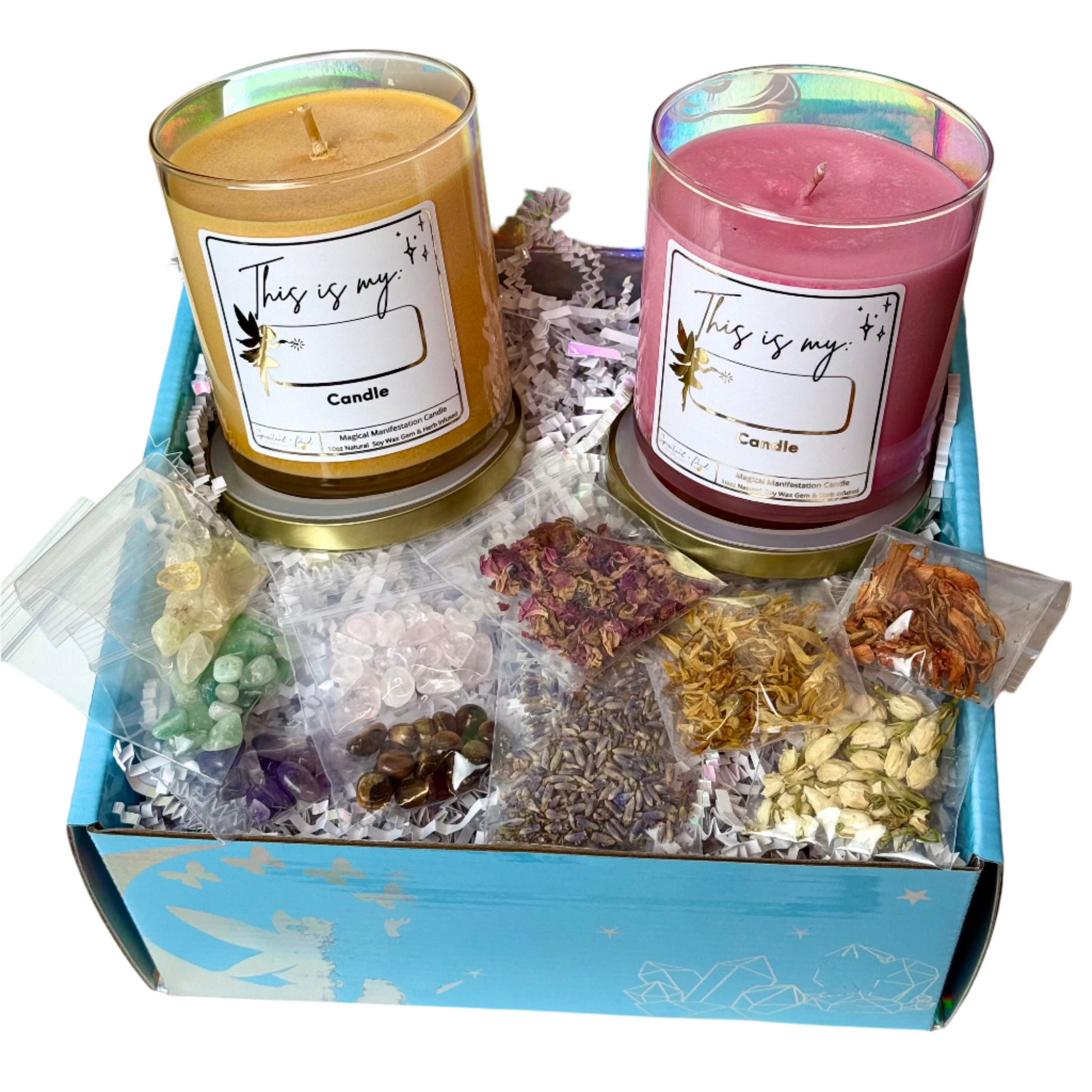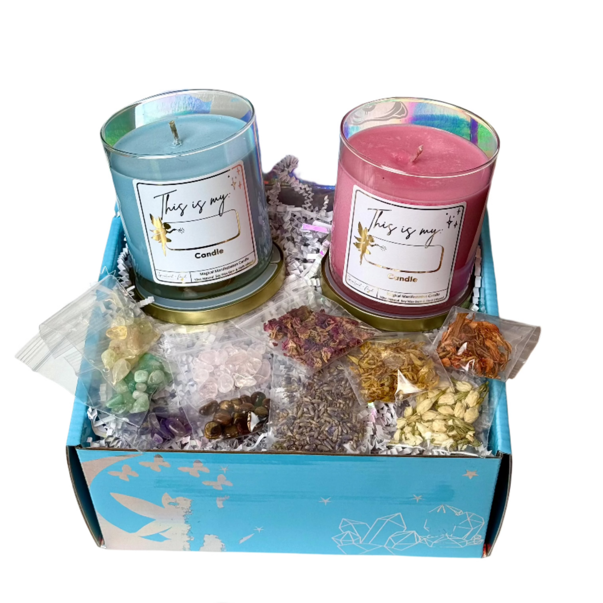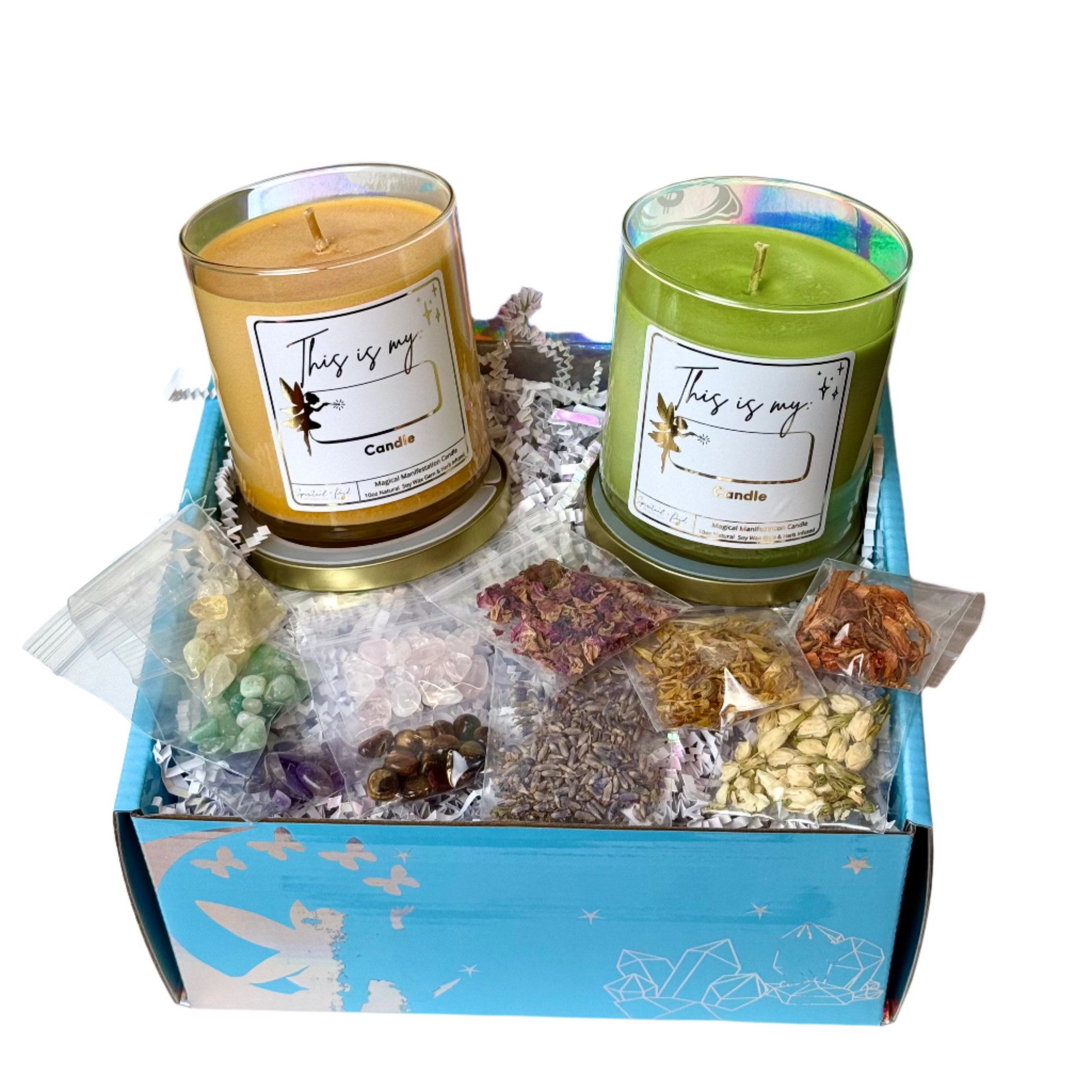 Harness the power of intention with the Create Your Own Manifestation Candle Kit. This expert-curated set includes carefully selected crystals, potent herbs, and two intuitively chosen candles, allowing you to personalize your manifestation ritual.